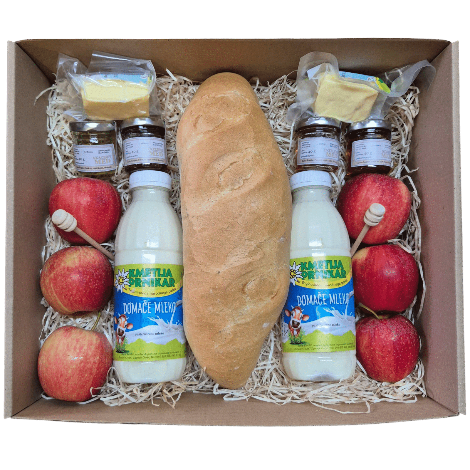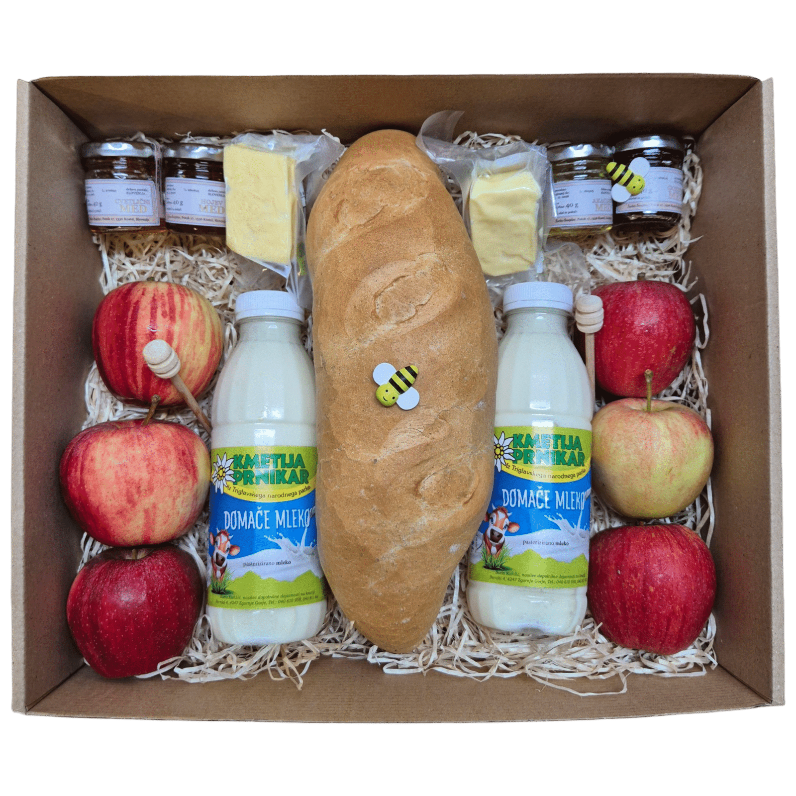 Ko odprete škatlo, zadiši po sveže pečenem kruhu, ki ga nežno premažete z domačim maslom in prelijete z zlatim medom. Ob strani vas čaka mleko, kot ga poznamo iz šolskih dni, in sočna jabolka, ki vas spomnijo na domači sadovnjak. Nič ni naključno, vsak izdelek ima svojo zgodbo in prihaja iz rok slovenskih čebelarjev, mlekarjev in kmetov, ki z ljubeznijo ohranjajo to tradicijo.